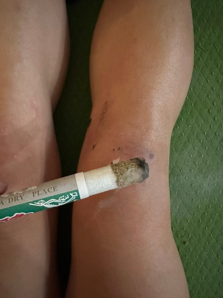 Whaat is moxibustion? It's a traditional Chinese medicine heat therapy burning mugwort (Artemisia vulgaris) close to the skin’s surface to stimluate a person's qi and overall wellness. It is also claimed to help with inflammation and pain. It goes with accupuncture and has been used since about 500 BCE in China.